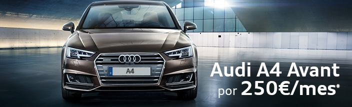 *Oferta Audi Financial Services calculada para un Audi A4 Avant S line 2.0 TDI 110 kW (150 CV) 6 vel. con un contrato de Renting a 36 meses y 45.000 km totales, abonando una entrada de 5.895€ a través de Volkswagen Renting S.A. La cuota y la entrada no incluyen IVA. Incluye todos los servicios en Red Oficial Audi de mantenimiento y desgaste, garantía (reparación de averías), seguro a todo riesgo sin franquicia y asistencia en viaje durante el periodo contratado. Cambio de neumáticos no incluido. Para otras versiones y equipamientos consulte en su Concesionario Oficial Audi. Oferta válida hasta el 30/06/2018 para vehículos matriculados hasta el 29/08/2018. Audi Financial Services es una marca comercializada por Volkswagen Renting S.A. Modelo visualizado no corresponde con la oferta.